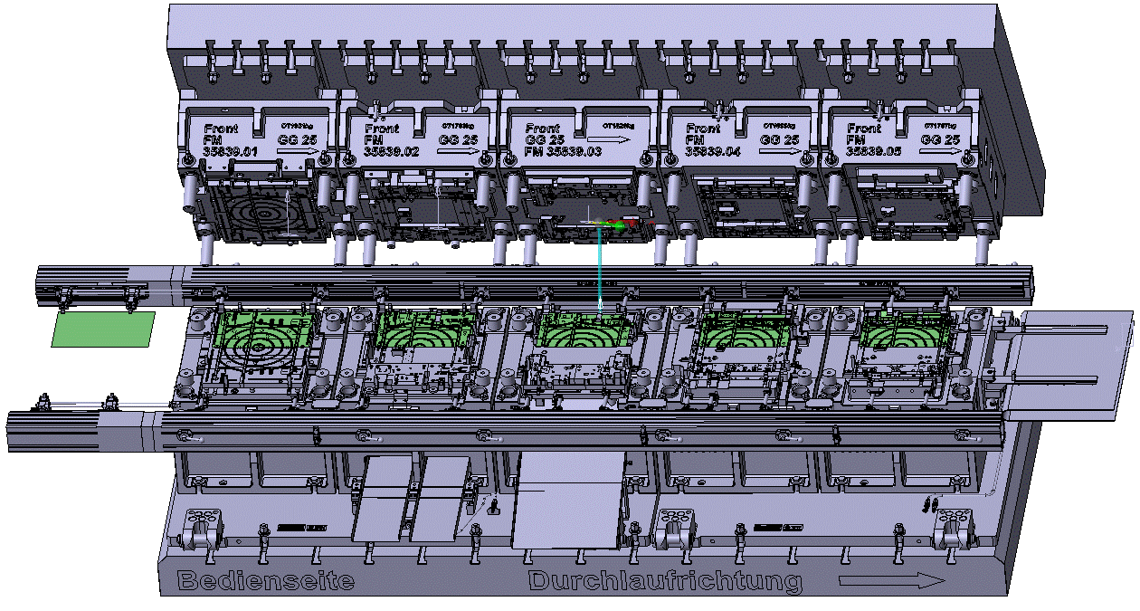 Herstellung von Werkzeugen bis 10 to Gesamtgewicht und Bearbeitungsgrößen von 3000 x 2000 können realisiert werden. Mit 6 CNC-Fräs- und 3 Erodiermaschinen decken wir das gesamte Arbeitsfeld des Werkzeugbaus in der Stanz- und Umformtechnik ab. In unserer Pressenabteilung erproben wir die hergestellten Werkzeuge bis zur Serienreife.